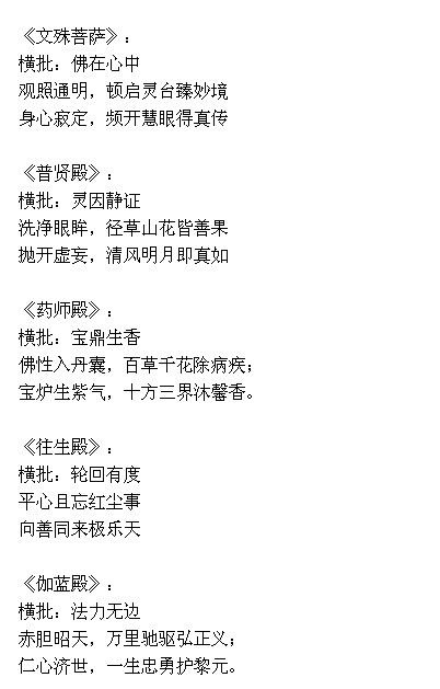 观音殿 紫竹清风,听声自在; 玉瓶翠柳,观色皆空。 江苏 胡光明 法雨遍施,不论西天东土; 慈航普度,何分南海北疆。 江苏 胡光明 甘露宝瓶,千姿玉手千丝雨; 莲台紫气,一朵琼花一片霞。 江苏 蒋继辉 接引殿 莲海清茶留客话; 鹫峰绿叶动堂春。 河北 杜向明