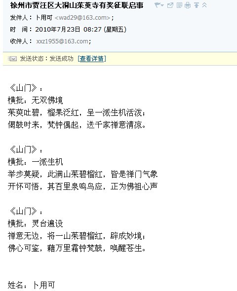 ---- [分享] 10.10.18揭晓:徐州市贾汪区茱萸寺入选对联和匾额 (http://www.zhgc.com/bbs/dispbbs.asp?boardid=295&id=239713)