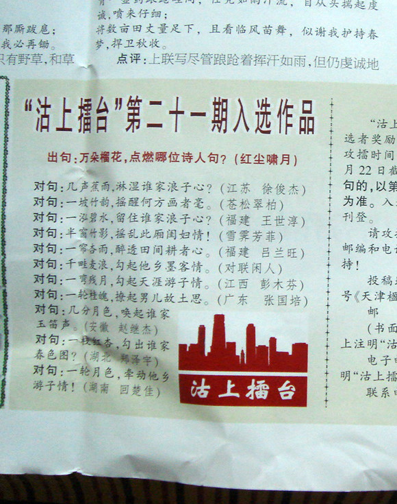 | -- 作者:江苏张修顺 -- 发布时间:2012/8/14 11:11:09 -- 万朵榴花,应该是在太阳底下最漂亮。而获奖句中有四个对的都是月亮,是不是景隔了?月光下能看到万朵榴花? |