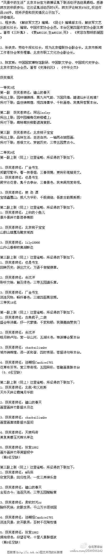 | -- 作者:余仁杨 -- 发布时间:2013/7/8 17:29:10 -- 13.07.05揭晓:“风景中的生活”北京丰台官方微博征集下联活动评选结果揭晓 http://e.weibo.com/u/2590506142?ref=http%3A%2F%2Fweibo.com%2F1271762232%2Fprofile%3Frightmod%3D1%26wvr%3D5%26mod%3Dpersonnumber#1373274922724 [此贴子已经被作者于2013-7-8 17:30:41编辑过] |