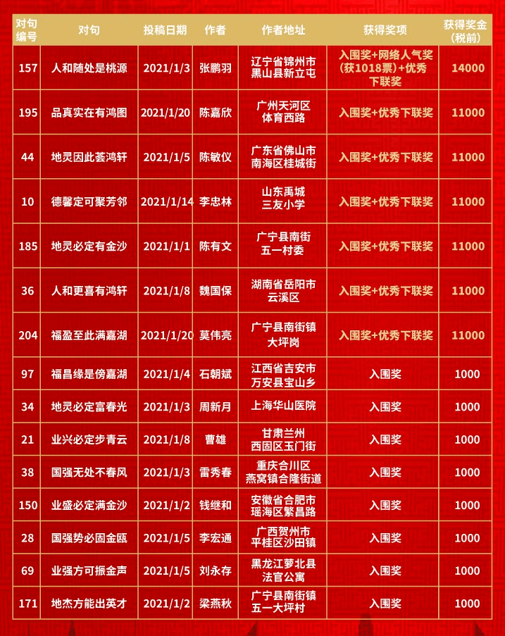 来源:广宁鸿轩地产 2021-02-07 10:55 家好、自然、多宝锭!为弘扬传统文化,进一步促进文化交流,在广宁县文联的指导下,历时一个多月的重金征联活动在社会各界及广大市民的见证之下圆满结束。我司鸿轩房地产和嘉湖金沙湾项目万分感谢大家对本次活动的热情关注,以及投稿参与活动的联友们的大力支持! 本次活动,本着公平、公正、公开的基本原则,以向社会各界人士探讨中国传统文化的态度,以重赏和评选的形式,为我司旗下项目嘉湖金沙湾征集与其关联并与出句对应的最佳下联!4166副投稿作品经过8个日夜的层层筛选,我们评选出15副入围作品。由于上联词性和结构多样化,虽通俗易懂,但不失“巧、妙、绝、难”的特质,在收到投稿的下联作品中,很遗憾,未能选出一副同时满足“字句对等、词性对品、结构对应、节律对拍、平仄对立、形成意联、融合嘉湖金沙湾基本特点”的最佳的下联。故此,主办方为表示对社会各界及广大参与者的由衷感谢,经综合考虑,现将最佳下联的七万元奖金改设为 7个优秀奖,各奖一万元奖金,由终审评分最高7副下联获得!现将本次活动获奖名单公示如下: 优秀奖获奖名单(7名,税前奖金10000元): 157号作品——人和随处是桃源 195号作品——品真实在有鸿图 44号作品——地灵因此荟鸿轩 10号作品——德馨定可聚芳邻 185号作品—— 地灵必定有金沙 36号作品——人和更喜有鸿轩 204号作品——福盈至此满嘉湖 网络人气奖获奖名单(1名,税前奖金3000元): 157号作品—— 人和随处是桃源 入围奖获奖名单(15名,税前奖金1000元): 10号作品—— 德馨定可聚芳邻 21号作品—— 业兴必定步青云 28号作品—— 国强势必固金瓯 34号作品—— 地灵必定富春光 36号作品—— 人和更喜有鸿轩 38号作品—— 国强无处不春风 44号作品—— 地灵因此荟鸿轩 69号作品—— 业强方可振金声 97号作品—— 福昌缘是傍嘉湖 150号作品—— 业盛必定满金沙 157号作品—— 人和随处是桃源 171号作品—— 地杰方能出英才 185号作品—— 地灵必定有金沙 195号作品—— 品真实在有鸿图 204号作品—— 福盈至此满嘉湖 获奖详情表: