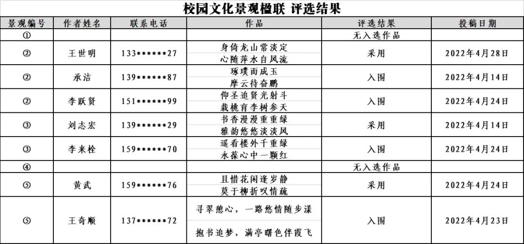 为丰富学院校园文化内涵,美化优化育人环境,学院于2022年4月面向社会进行校园文化景观的命名和楹联公开征集,得到了社会各界人士、各届校友和广大师生的热情支持和参与,累计收到175人超过650个投稿。经过征集、遴选、推荐、评审、网络投票等多个工作环节,评选出19件入围作品,并在此基础上遴选出7个作品进行采用。因景观尺寸原因,评选组对入选楹联长度作缩减调整。现予以公示。 近期,学院党委宣传部将与入围作品及采用作品的作者进行联系,学院党委宣传部的联系电话为:0799—7062748,学院将向入围作品及采用作品的作者发放奖励。 江西工业工程职业技术学院 2022年6月14日 附件1.校园文化景观命名和楹联评选结果 |