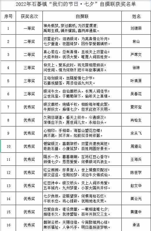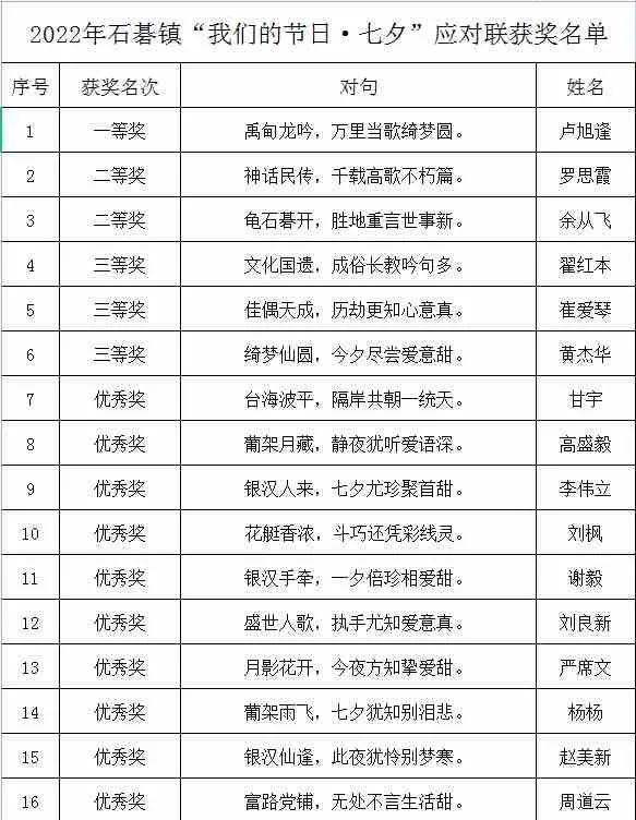 | -- 作者:梁星 -- 发布时间:2022/8/11 22:44:12 -- 22.08.11揭晓:番禺石碁镇“我们的节日·七夕”征联大赛结果出炉 来源:番禺石碁融媒 2022-08-11 17:48 发表于广东 一等奖作品,其中,“禹甸龙吟,万里当歌绮梦圆”获得应对赛一等奖(出句征对:“星桥鹊驾,经年才诉离情苦;”)评委们表示,“禹甸”代表中国,“龙”对“鹊”,对仗工整;也因其气势雄浑,意境、寓意极好,属大题材作品,实至名归。 应对联获名单 自撰联获奖名单 [此贴子已经被作者于2022/8/11 22:49:21编辑过] |