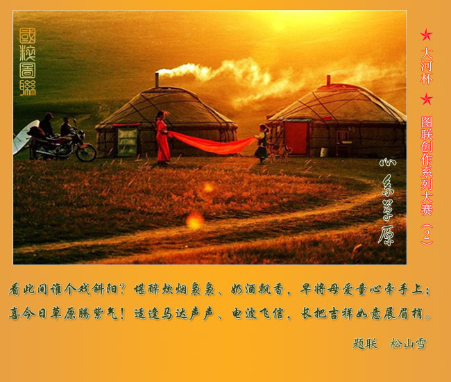 本期题图,选用草原生活题材,截取了牧民生活的一个片段,通过蒙古包、摩托车、夕烟及人物活动场面,加上强烈的暖色调,充分表达了新一代牧民的欢乐、幸福、和谐美满。依图撰联,首先要紧扣主题。在这次评出的前五名中,整体上看主题突出,表意明确,对仗工稳,在表现手法上,也各有千秋。
