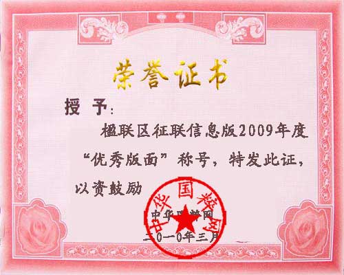 | -- 作者:春光明媚 -- 发布时间:2009/12/3 14:07:43 -- 征联版版面、版主历年所获荣誉 (请获得荣誉者和知情者提供资料和链接,以便添加) 征联信息版获得2009年国粹网“优秀版面”称号,奖励版面国粹网积分5000分。 http://www.zhgc.com/bbs/dispbbs.asp?boardid=390&star=1&replyid=67566&id=202988&skin=0&page=1 ![]() [此贴子已经被作者于2010-8-26 13:40:25编辑过] |