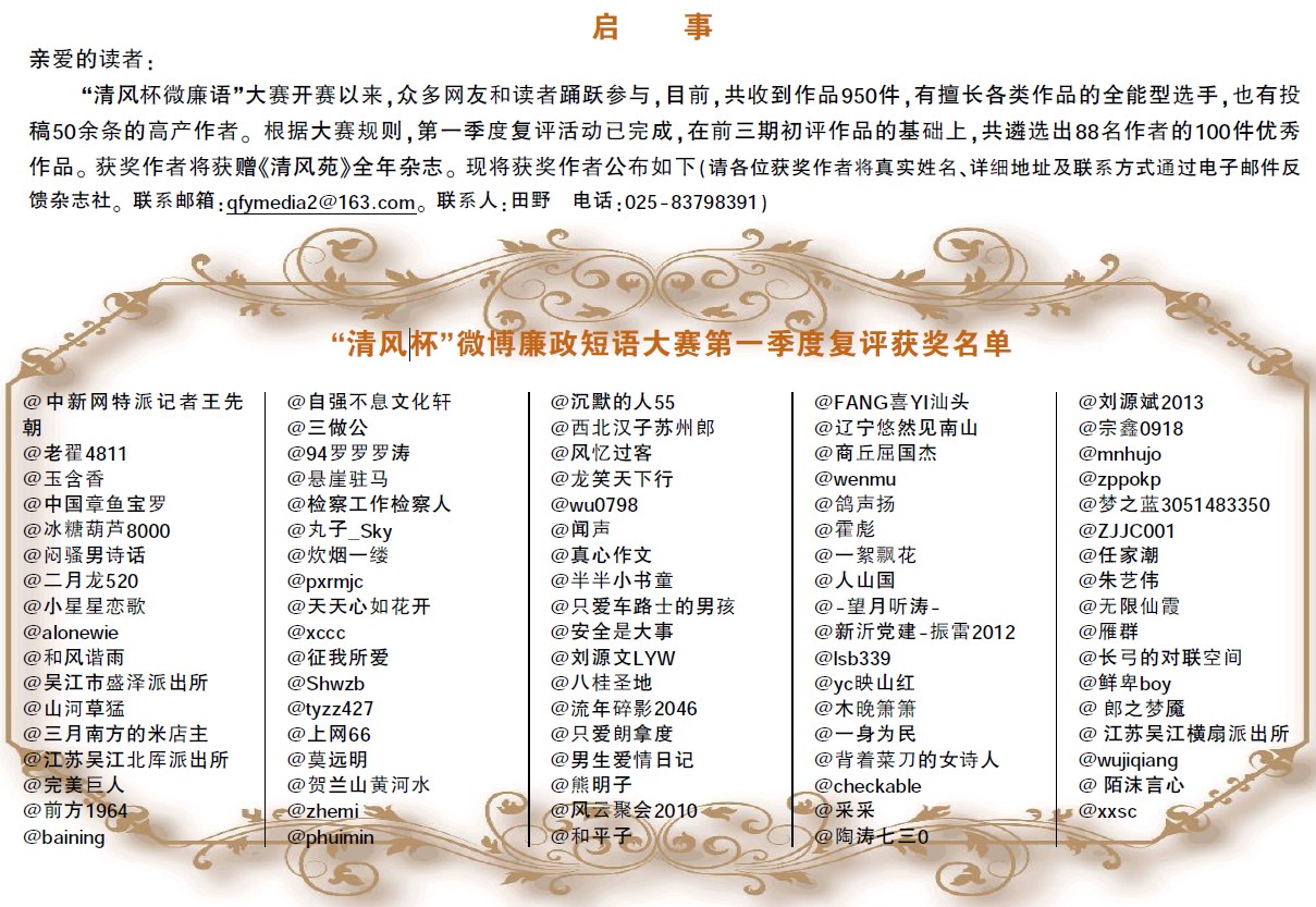 | -- 作者:中山道人 -- 发布时间:2013/12/12 0:42:38 -- http://bbs.jschina.com.cn/thread-4112485-1-1.html [“清风杯”微廉语大赛] “清风杯”微博廉政短语大赛第一季度复评获奖名单 小白 发表于 2013-5-9 11:07 | “清风杯微廉语”大赛开赛以来,受到众多网友和读者的踊跃参与,目前,共收到作品950件,有擅长各类作品的全能型选手,也有陆续投来50余条的高产作者。根据大赛规则,第一季度复评活动已完成,在前三期初评作品的基础上,共遴选出88名作者的100件优秀作品,并奉上《清风苑》全年杂志以资奖励。现将获奖作者名单公布如下,同时请各位获奖作者将详细地址及联系方式通过电子邮件的形式反馈杂志社,以便我们寄发奖品。联系邮箱:qfymedia2@163.com。 “清风杯”微博廉政短语大赛第一季度复评获奖名单 @中新网特派记者王先朝 @老翟4811 @玉含香 @中国章鱼宝罗 @冰糖葫芦8000 @闷骚男诗话 @二月龙520 @小星星恋歌 @alonewie @和风谐雨 @吴江市盛泽派出所 @山河草猛 @三月南方的米店主 @江苏吴江北厍派出所 @完美巨人 @前方1964 @baining @自强不息文化轩 @三做公 @94罗罗罗涛 @悬崖驻马 @检察工作检察人 @丸子_Sky @炊烟一缕 @pxrmjc @天天心如花开 @xccc @征我所爱 @Shwzb @tyzz427 @上网66 @莫远明 @贺兰山黄河水 @zhemi @phuimin @沉默的人55 @西北汉子苏州郎 @风忆过客 @龙笑天下行 @wu0798 @闻声 @真心作文 @半半小书童 @只爱车路士的男孩 @安全是大事 @刘源文LYW @八桂圣地 @流年碎影2046 @只爱朗拿度 @男生爱情日记 @熊明子 @风云聚会2010 @和平子 @FANG喜YI汕头 @辽宁悠然见南山 @商丘屈国杰 @wenmu @鸽声扬 @霍彪 @一絮飘花 @人山国 @-望月听涛- @新沂党建-振雷2012 @lsb339 @yc映山红 @木晚箫箫 @一身为民 @背着菜刀的女诗人 @checkable @采采 @陶涛七三0 @刘源斌2013 @宗鑫0918 @mnhujo @zppokp @梦之蓝3051483350 @ZJJC001 @任家潮 @朱艺伟 @无限仙霞 @雁群 @长弓的对联空间 @鲜卑boy @郎之梦魇 @江苏吴江横扇派出所 @wujiqiang @陌沫言心 @xxsc |