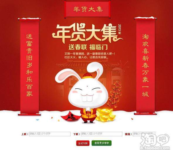 先注册淘宝,再参赛。 上联:顽兔玩图淘宝去 下联:金蛇进社献珠来 横批:红包拿来
