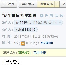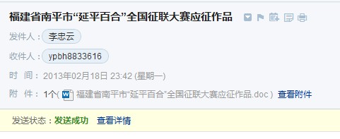 | -- 作者:中山道人 -- 发布时间:2013/3/20 8:02:17 -- 您发给我的稿件已经收到,谢谢您参加“延平百合”征联活动! |