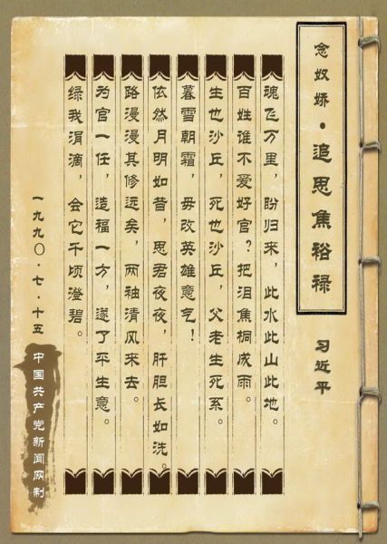 | -- 作者:柳岸花明 -- 发布时间:2014/3/18 19:59:47 -- 习近平1990年词作《念奴娇·追思焦裕禄》 中夜,读《人民呼唤焦裕禄》一文,是时霁月如银,文思萦系…… 魂飞万里, 盼归来, 此水此山此地。 百姓谁不爱好官? 把泪焦桐成雨。① 生也沙丘, 死也沙丘, 父老生死系。② 暮雪朝霜, 毋改英雄意气! 依然月明如昔, 思君夜夜, 肝胆长如洗。 路漫漫其修远矣, 两袖清风来去。 为官一任, 造福一方, 遂了平生意。 绿我涓滴, 会它千倾澄碧。 一九九〇·七·十五 |