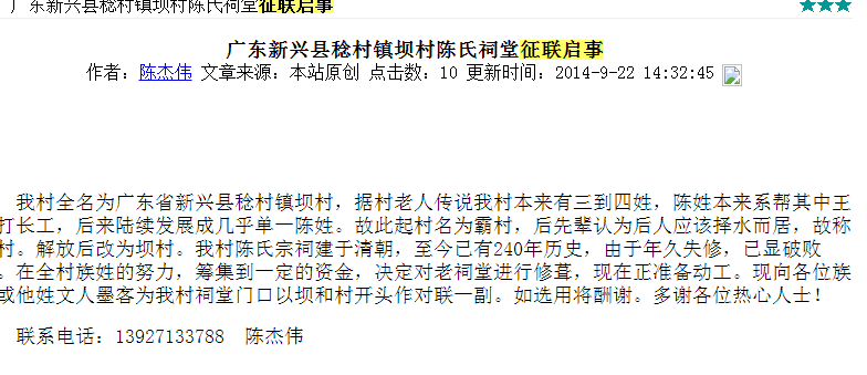 -- 14.09.XX截止:广东新兴县稔村镇坝村陈氏祠堂征联启事