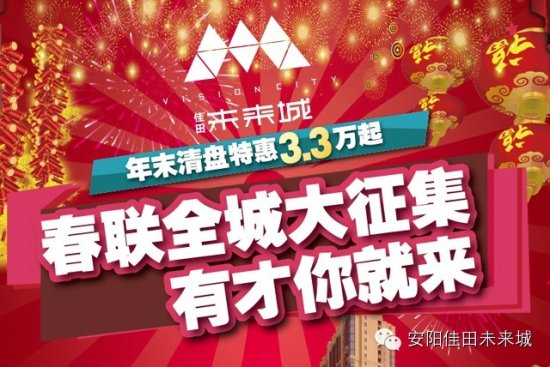 赢现金更过瘾!【荷湖星城】888元征集2015新春对联!只要参与就有礼品,快来吧! 2014-12-10 千禧 · 荷湖星城 春节已临近,元旦近在咫尺,荷湖星城全城征集新春对联, 888元现金大奖,精美礼品等统统拿回家!淮安的父老乡亲们,快快贡献你们的聪明才智,为淮安的春节增一抹色彩! 春联,是一种独特的中国文学形式。它以工整、对偶、简洁、精巧的文字描绘时代背景,抒发美好愿望。每逢春节,无论城市还是农村,家家户户都要精选一副大红春联贴于门上,辞旧迎新,以增加节日的喜庆气氛。 为迎接2015新年到来,荷湖星城特征集新春对联 入选的前两名作品将作为荷湖星城2015年度新春对联印制发放 具体如下: 征联要求 1、内容紧扣迎春主题,遣词文雅,立意新颖,符合联律,对仗工整,新旧四声皆可(但不能混用)。 2、楹联可含横匾,以短联为主,单边一般不超过10个字。 3、楹联内容要立意高妙,文字要包含“荷湖星城”案名。藏头或嵌含均可。如: (藏头类:上联:荷湖迎春春风扑面 下联:星城见喜喜气盈门) (嵌含类:上联:百花齐放荷湖春光好 下联:万马奔腾星城气象新) 4、本次征联不收参赛费,不退稿。投稿件数不限。 参赛流程 1、作品征集阶段:12月10日-12月16日 千禧·荷湖星城 微信平台 征集活动在项目微信平台开展,所有作品稿件投递至“千禧·荷湖星城”微信平台,以对话形式将稿件内容发送至后台; 新朋友最直接的参与方法:本文拉到顶部 ↑↑↑ 点击“千禧·荷湖星城”---加关注---对话框发送稿件进行投稿; 或者也可以 ↓ ↓ ↓ 操作方法1:微信公共号搜索“千禧·荷湖星城”---加关注---对话框发送稿件+姓名+联系电话 进行投稿; 操作方法2:扫描荷湖星城广告或宣传品上的二维码---添加关注---对话框发送稿件进行投稿; http://mp.weixin.qq.com/s?__biz=MzAwMzAwNTc1Mw==&mid=201884678&idx=1&sn=1945d05fee07af853e5f8583148a9ce8#rd [此贴子已经被作者于2014-12-16 15:29:46编辑过]