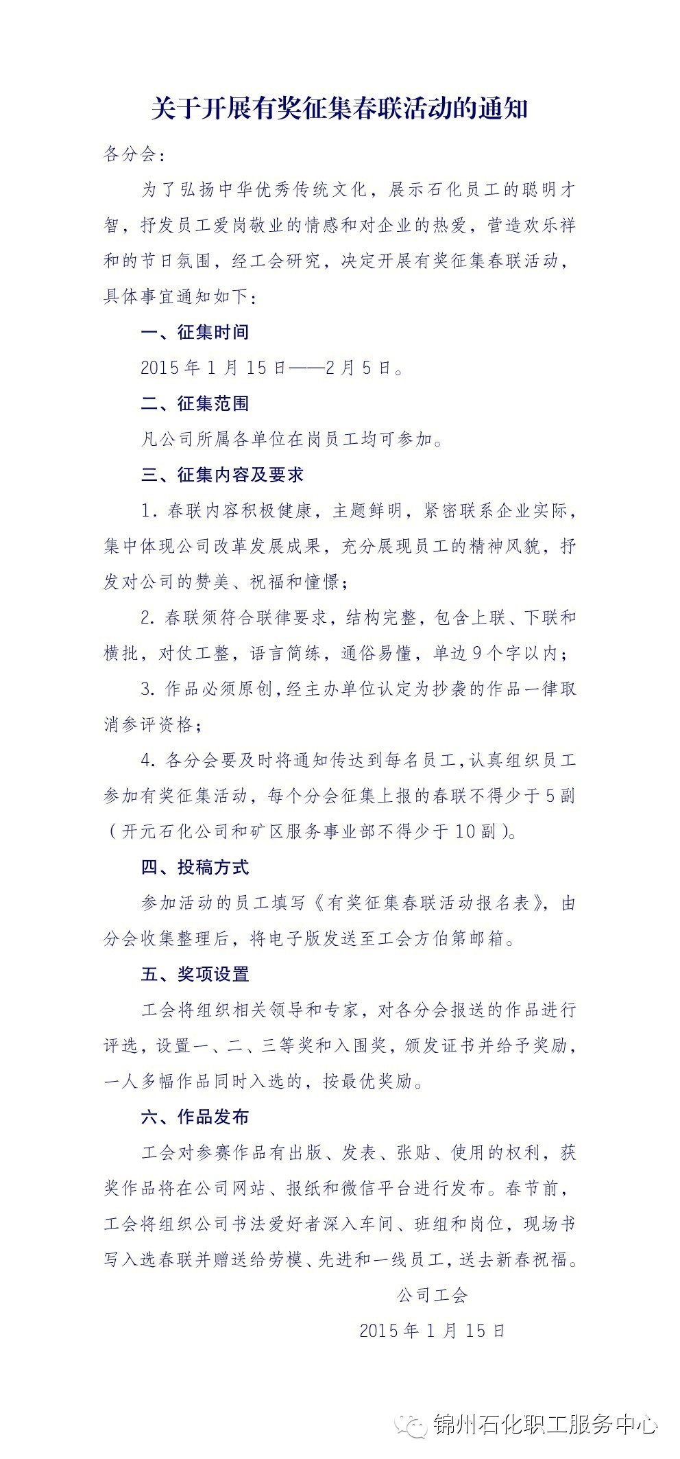 http://mp.weixin.qq.com/s?__biz=MzA4MzEyOTgwNw==&mid=202257663&idx=1&sn=98bf7640ab663c90cbc9c0ec0a7e7922&3rd=MzA3MDU4NTYzMw==&scene=6#rd 关于开展“喜迎新春楹联征集”活动的通知 2015-01-03中铁一局新运公司 关于开展“喜迎新春楹联征集”活动的通知 阔别丰收和喜悦的2014年,我们一起迎来了充满希望与挑战的2015年。为了弘扬“诚信务实、卓越创新”的企业精神,营造共建企业和谐文化的良好氛围,使全体新运人以良好的精神面貌迎接公司第四次党代会的召开,公司决定在微信平台开展“喜迎新春楹联征集”活动。具体要求如下: 一、征集形式 (一)应对楹联(根据各上联拟出相对应的下联) 1、上联:新运将士铺铁道架金桥建城轨拓运营欢天喜地喜迎羊年新春; 2、上联:铺万里平安路,架千座精品桥,精细管理筑就一局铺架品牌; 3、上联:擂三通战鼓助新运男儿乘风破浪续写铺轨架桥承包运输城铁建设新篇章; 4、上联:开盛会、谋发展,党旗引领耀征程; 5、上联:六十年发展历程踏石留印可歌可泣必将彪炳史册; 6、上联:品牌卓越、员工富裕,砥砺拼搏六十载,再绘发展新蓝图; 7、上联:新运文化扬天下,诚信为本筑精品,铺轨架桥穿山越水连通九州四海; 8、上联:新春祈福、运开时泰,马岁荣光辉日明; 9、上联:誓做项目精细管理千里马争当全面深化改革领头羊; 10、上联:新业绩新纪录新面貌新益求新爱我新运。 (二)自撰楹联 公司员工可以结合以下主题直接拟出上下联:(1)结合当前中国高铁走出国门的大好形势;(2)结合正在开展的全面深化改革及精细化管理工作;(3)结合公司即将召开的第四次党代会;(4)结合公司各项目施工运输生产经营情况;(5)结合公司的历史,独特的企业文化、行业特点;(6)结合时下公司一线员工能够传递正能量的所见所闻、所思所想。 二、活动安排 本次楹联征集活动面向本平台的所有关注者及社会各界人士,欢迎大家关注分享本平台。 1、征集阶段(2015年元月3日至2015年元月31日)。公司将于即日起正式发布通知,开始楹联征集。参与者须通过公司微信平台回复“春联”或“楹联”,根据平台所出上联应对下联或自撰楹联,条数不限。回复完对联后,输入姓名+电话+所在单位,点击提交即可。 2、评审阶段(2015年2月1日至2015年2月10日)。我们将邀请公司领导及文学爱好者组成评选委员会,对本次活动的征集稿件按照要求进行初评和复评,选出优秀作品若干名,并给予原创者奖励。 3、应用阶段(2015年2月10日至春节)。公司将邀请书法爱好者对获奖作品进行书写,并将相关书法楹联作品邮寄原创者。优秀的楹联作品将在公司机关和各项目部张贴,以进一步向业主及当地社会展示企业文化。 三、作品要求 1、参赛作品必须为原创,被认定抄袭的作品一律取消参评资格。 2、参赛作品必须符合楹联的创作习惯,做到内容相互照应、结构完整统一,内容紧扣主题,语言鲜明简练。 “喜迎新春楹联征集”活动开始在即,希望公司广大员工踊跃参与,喜迎羊年新春。 公司微信平台联系邮箱: 195675025@qq.com, 电话029-33789482。 中铁一局新运公司 2015年1月3日