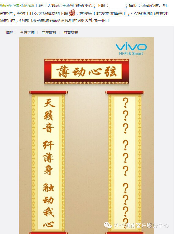 【V粉赛诗会】x5max对联征集热闹非凡 2014-11-14vivo河南客户服务中心 13日,vivo官方新浪微博@vivo智能手机 在微博发起了一个考验V粉才华的对联征集活动,但看了V粉们的回复后,小V觉得,与其说这是“考验”,不如说这是一次大规模的“炫耀”V粉文采的诗会啊,好对、奇对、绝对层出不穷。小伙伴们都惊呼,V粉都是群什么样的世外高人啊。下面来看看活动现场,首先是活动主持人@vivo智能手机 给出上联和横批,由网友回答。 http://mp.weixin.qq.com/s?__biz=MzA4NDYxMTIzNQ==&mid=206327383&idx=2&sn=6869012a84eda4f513289ff4e16e634e&3rd=MzA3MDU4NTYzMw==&scene=6#rd