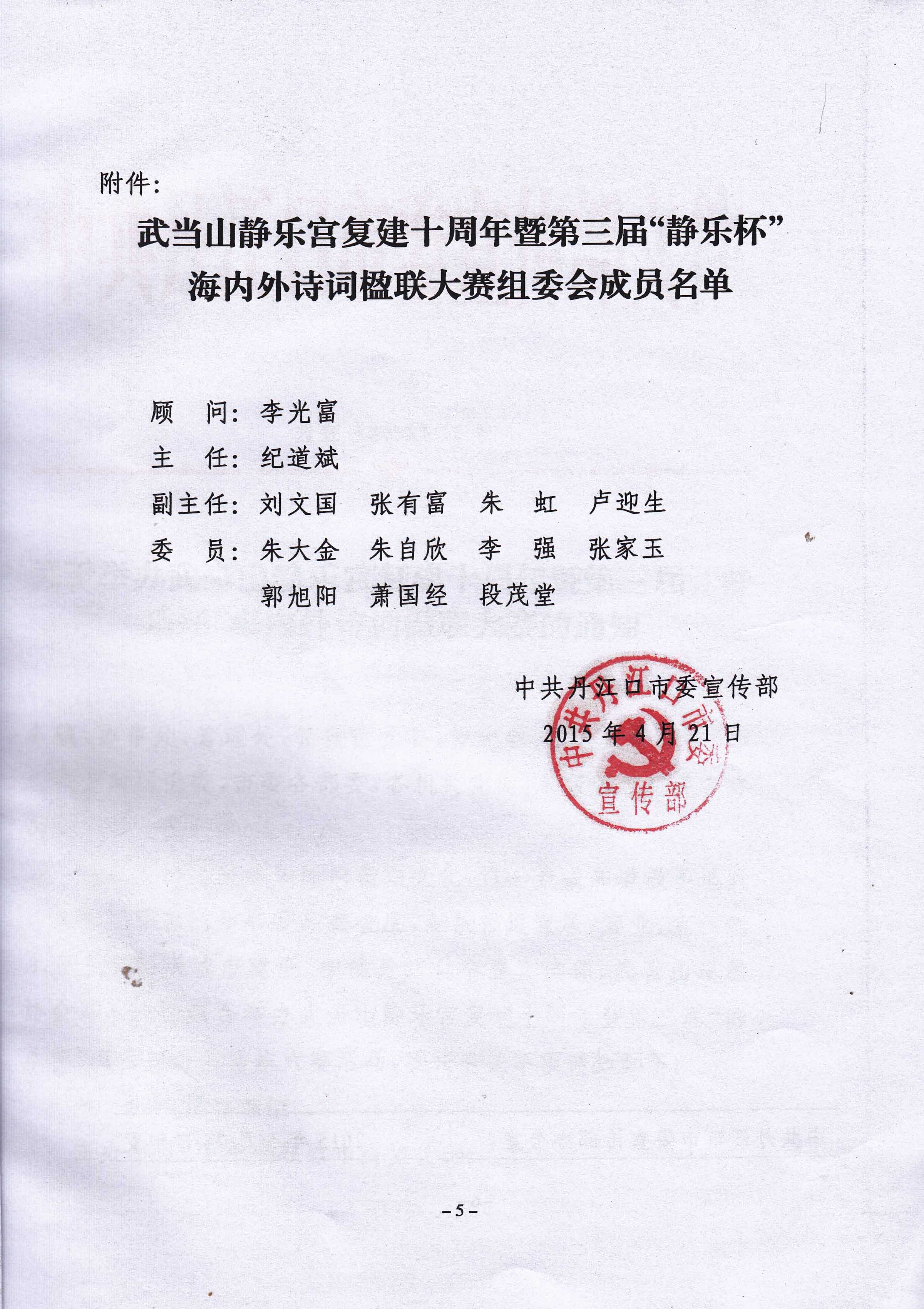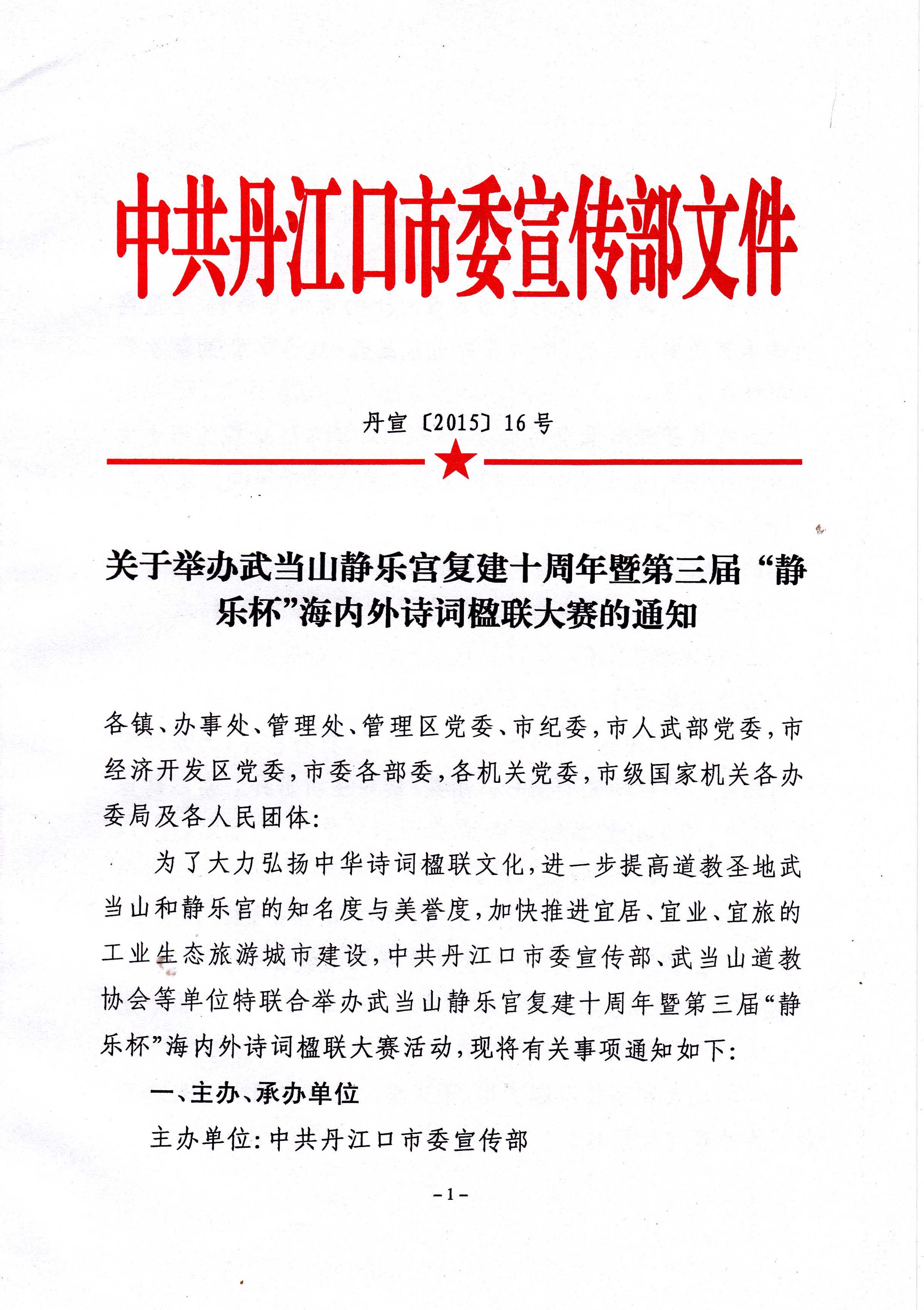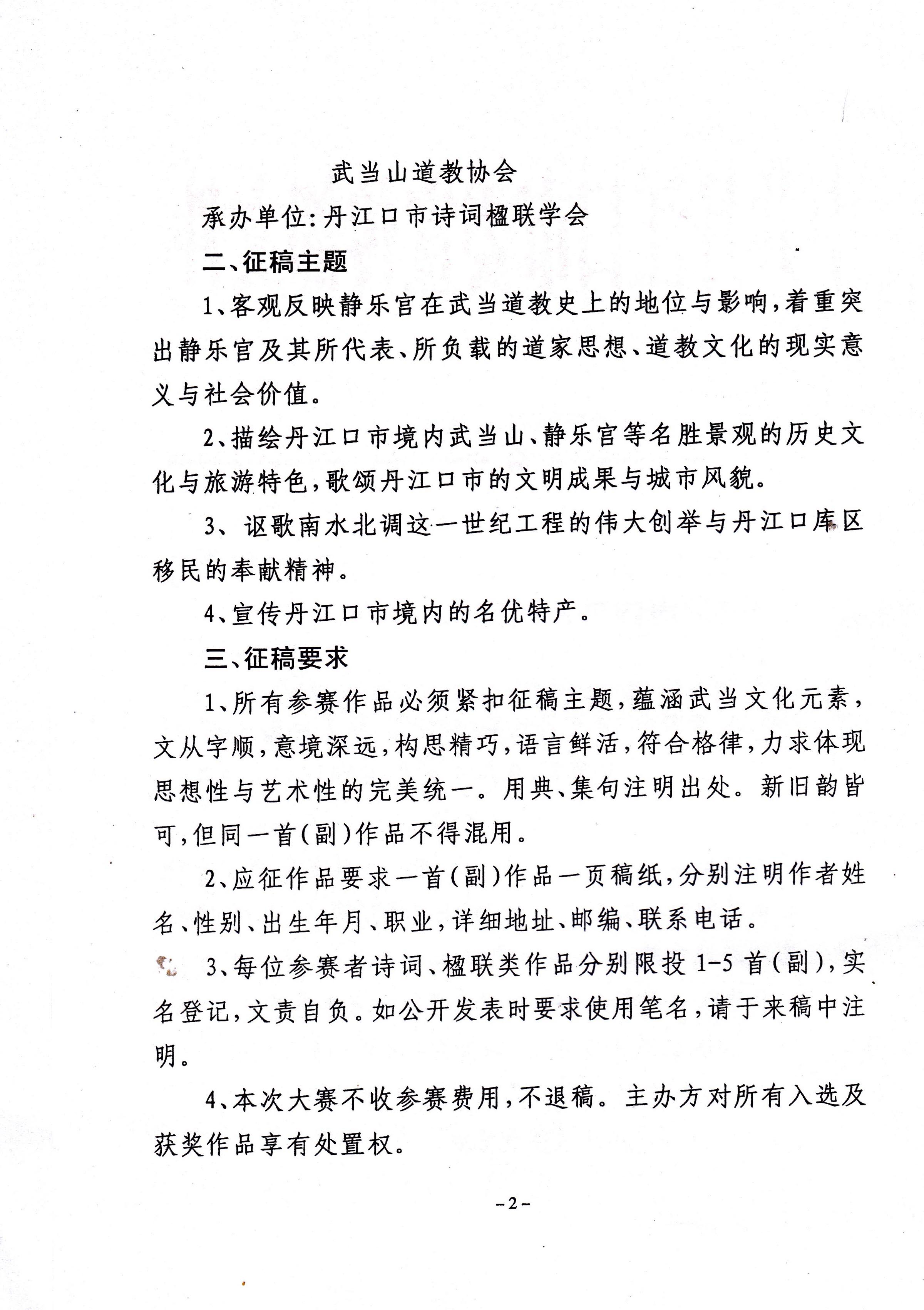 | -- 作者:汉江联苑 -- 发布时间:2015/6/12 10:30:37 -- 15.10.31截止:武当山静乐宫复建十周年暨第三届“静乐杯”海内外诗词楹联大赛征稿启事 武当山,是以崇奉玄天上帝为主神的道教名山,也是中国唯一的以道教列为世界文化遗产的名山。在中华道脉的辉煌历史上,这里曾经是朱明王朝的皇室家庙与内家武术的发源地,素有“举世无双胜境,天下第一仙山”的美誉。自春秋以降,就有尹喜、陈抟、张守清、张三丰等高人异士遁迹于此,修真悟道,以求长生久视之术。 静乐宫为武当山古建筑群中的重要建筑单元,是世界文化遗产的重要组成部分,原址位于古均州城内,相传为静乐国太子(即真武大帝、玄天上帝)降生之地。明永乐十七年(1419年),成祖朱棣敕建玄帝殿、圣父母殿、左右圣旨碑亭、神库、神厨、方丈、斋堂、道房、厨室、紫云亭等,共计一百九十七间,并赐“静乐宫”为额,居武当山九宫之首。其后近六百年间屡有续建、扩建,兴废更迭,历经沧桑。1958年因兴修丹江口水库,静乐宫所有文物随之运抵丹江口城区东郊新址,先后复建了棂星门、山门、龙虎殿、玄帝殿、父母殿、碑亭、紫云亭、配殿、道房、焚香炉等主体建筑,并于2006年举行了隆重的落成开光大典,正式对外开放。 为了大力弘扬中华诗联文化,积极培育和践行社会主义核心价值观,进一步提高道教圣地武当山和丹江口市的知名度与美誉度,中共丹江口市委宣传部、武当山道教协会等单位借静乐宫复建十周年之机,特联合举办武当山静乐宫复建十周年暨第三届“静乐杯”海内外诗词楹联大赛,现将有关事项通知如下: 一、主办、承办单位 主办单位:中共丹江口市委宣传部 武当山道教协会 承办单位:丹江口市诗词楹联学会 二、征稿主题 1、客观反映静乐宫在武当道教史上的地位与影响,着重突出静乐宫及其所代表、所负载的道家思想、道教文化的现实意义与社会价值。 2、描绘丹江口市境内武当山、静乐宫等名胜景观的历史文化与旅游特色,歌颂丹江口市的文明成果与城市风貌。 3、讴歌南水北调这一世纪工程的伟大创举与丹江口库区移民的奉献精神。 4、宣传丹江口市境内的名优特产。 三、征稿要求 1、所有参赛作品必须紧扣征稿主题,蕴涵武当文化元素,文从字顺,意境深远,构思精巧,语言鲜活,符合格律,力求体现思想性与艺术性的完美统一。用典、集句注明出处。新旧韵皆可,但同一首(副)作品不得混用。 2、应征作品要求一首(副)作品一页稿纸,分别注明作者姓名、性别、出生年月、职业、详细地址、邮编、联系电话。 3、每位参赛者诗词、楹联类作品分别限投1—5首(副),实名登记,文责自负。如公开发表时要求使用笔名,请于来稿中注明。 4、本次大赛不收参赛费用,不退稿。主办方对所有入选及获奖作品享有处置权。 四、时间安排 本次大赛征稿时间从征稿启事发布之日起至2015年10月31日止。届时将邀请国内诗词与楹联界专家对所有应征作品进行公开、公平、公正评审,并于2015年11月30日公布评选结果。 五、奖项设置 本次大赛分格律诗词、楹联二组,分别设一等奖1名,奖金5000元;二等奖2名,奖金各2000元;三等奖5名,奖金各500元;优秀奖100名(诗词、楹联各50名)。所有获奖者均颁发证书。大赛结束后,由国家正规出版社出版获奖作品专集,并向所有获奖作者免费赠送。 六、投稿方式 1、纸质稿件请寄:湖北省丹江口市人民路1号(市老年活动中心二楼)、市诗词楹联学会,张家玉老师收(邮编:442700)。 2、电子稿件请发送邮件至:1371230035@qq.com。 3、纸质、电子稿件请只选择一种投稿方式,请勿一稿两投。无论纸质、电子来稿均须在信封或来稿的标题位置注明“静乐杯”字样。 为了确保活动顺利开展,本次大赛特成立组委会,办公地点设在丹江口市诗词楹联学会办公室(市老年活动中心),办公室电话:0719-5211646,联系人:张家玉(手机:13035273558)。 武当山静乐宫复建十周年暨第三届“静乐杯” 海内外诗词楹联大赛组委会 2015年4月21日 [此贴子已经被作者于2015-6-12 10:58:33编辑过] |
