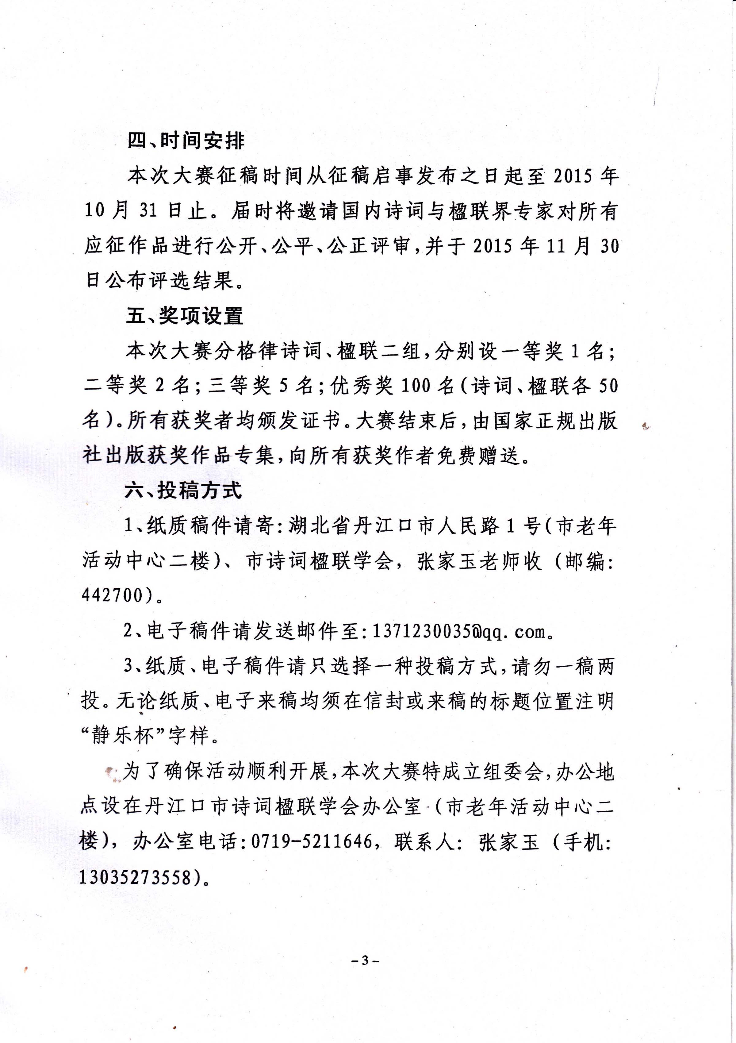 | -- 作者:汉江联苑 -- 发布时间:2015/6/29 17:55:00 -- 提醒各位诗家联友不要重复发稿,对于电子邮箱来稿,在征稿期内,一般每周登记一次,凡符合参赛要求的稿件我们都会一一回复,请予理解和支持! 同时烦请各位老师复制链接,将本次征稿启事转发至各论坛、贴吧、QQ群,或跟帖支持,再次拜谢!静乐杯诗联群QQ:182810901