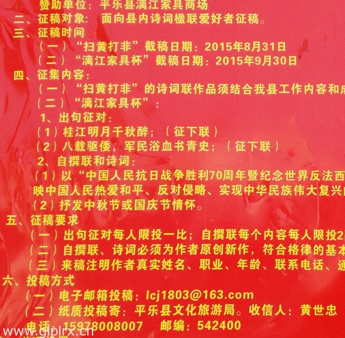 | -- 作者:余仁杨 -- 发布时间:2015/8/31 11:48:10 -- 15.09.30截止:平乐县“扫黄打非”(15.08.31截止)暨“漓江家具杯”征联征诗启事【限县内】