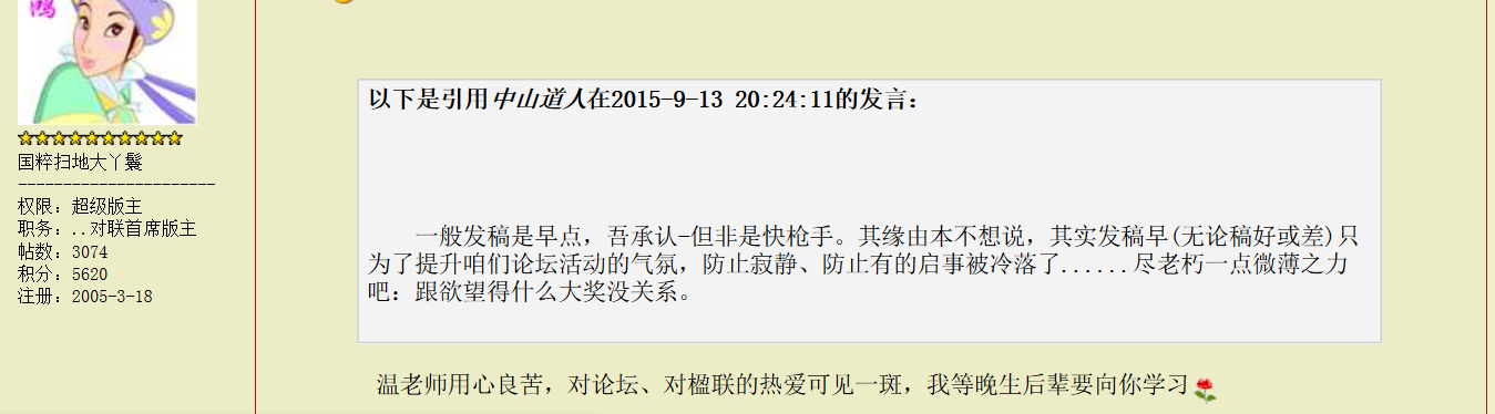 | -- 作者:龙门野鹤 -- 发布时间:2015/9/23 7:40:13 -- 悼念联坛老将---中山道人 |