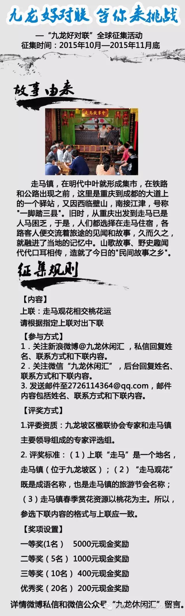 | -- 作者:班首长 -- 发布时间:2015/10/26 22:32:34 -- 【送福利】有赏征集九龙好对联,5000元红包等你拿!!! 2015-10-23 九龙休闲汇 九龙休闲汇 九龙休闲汇 [IMG][/IMG] 微信号 jiulongpolvyou 功能介绍 九龙坡区旅游相关资讯推广宣传,带你玩转九龙坡!!! 2015年还剩69天啦,小九也要开始最后一个季度的疯狂福利送了。 什么?对个对联就有奖金拿? 是的!最高个人奖金5000元大红包送给你。请根据指定上联内容对出下联 上联:走马观花相交桃花运【评奖方式】1. 评委资质:九龙坡区楹联协会专家组成的专家评选组。 2. 评奖标准:(1)上联“走马”是一个地名,走马镇(位于九龙坡区); (2)“走马观花”既是成语名称,也是走马镇的旅游节会名称; (3)走马镇春季赏花资源以桃花为主。所以,参选下联内容的格式与上联应一致。【参加方式】1.关注新浪微博“九龙休闲汇”,私信回复姓名、联系方式和下联内容。 2.关注微信“九龙休闲汇”,后台回复姓名、联系方式和下联内容。 3. 发送邮件至2726114364@qq.com,邮件内容包括姓名、联系方式和下联内容。 4. 活动截止时间:2015年11月30日。【奖项设置】一等奖: 5000元/人,1名。 二等奖:1000元/人,5名。 三等奖:400元/人,15名。 优秀奖:100元/人,30名。关于活动,如有任何疑问可以@九龙休闲汇私信 和 微信公众号“九龙休闲汇”留言。 而在走马民间,还流传着许许多多神奇而动人的故事。 与此同时,高台回到了走马镇,为三年后的殿试考试认真准备着。这位高台壮士,性格耿直,是名副其实武勇超群的英雄人物。高台父母早就过世了,现在独身一人过日子,为人心地善良,勤劳勇敢,镇里人有事都爱找他帮忙。 阳春三月,高台在金马湖边的空地练习骑射。一日上午,突然,一只白兔蹿出来衔走了箭筒。高台还在纳闷兔子哪来的力气可以衔走跟自己体重相当的箭筒,却见这兔子衔着箭筒在桃花山脚下看着高台。高台没缘由的下了马,却见兔子朝山上跑去了,高台迟疑着追了出去。 进到桃花山,正是漫山粉嫩桃花开得最娇艳的时候。眼见兔子进了一片桃花林,高台也追了过去。可是桃花迷人眼,哪里还有兔子的踪迹。迷迷糊糊中,琴音绕梁,循着琴声,高台看见一位女子身影,正背对着自己弹琴。忽见女子脚边一只白兔,不正是刚才衔走箭筒的那只兔子嘛。 却见此时,弹琴女子转身对高台行了常礼,轻声说道,“高公子,小女玉浅有礼了!”说着抬眼对高台微微一笑,高台望着玉浅,竟看痴了…… 原来这名叫玉浅的女子不是凡人,而是集天地灵气而生的灵女,无父无母,虽说没有上天入地的神仙本领,却可以通过施法布阵让人心想事成。 玉浅不想高郎离开走马而有思乡情,两人就在桃花山上住了下来。很快,清乾隆二十五年就到了,高台应该去参加武举殿试。若是拔得头筹,就要终日周旋于官场,不似现在轻松自由。思虑再三,高台跟玉浅说道,“我在京城参加会试期间,结实了一位好兄弟,名叫马全,本来他已经算是功成名就,可是因为在职期间与同僚发生矛盾被削夺官职。他为洗刷耻辱,决意再次夺取功名,他文武双全,肯定能够成为下届武举状元。我本希望在考试中助他一臂之力,现在却是不能了。”玉浅娇柔一笑,对着高台肯定说道:“高郎放心,马公子一定会是这届武举状元”。 清乾隆二十五年(1760年),马全成为了庚辰武科状元。原来,玉浅在桃花山上设下“马”字迷阵,帮助马公子拔得头筹。 就这样,高台和玉浅在桃花山上开始了神仙眷侣的生活。 全线免费, 2015玩转九龙坡 科普亲子游活动报名啦!!!猛戳下方阅读原文报名。↓↓↓ |