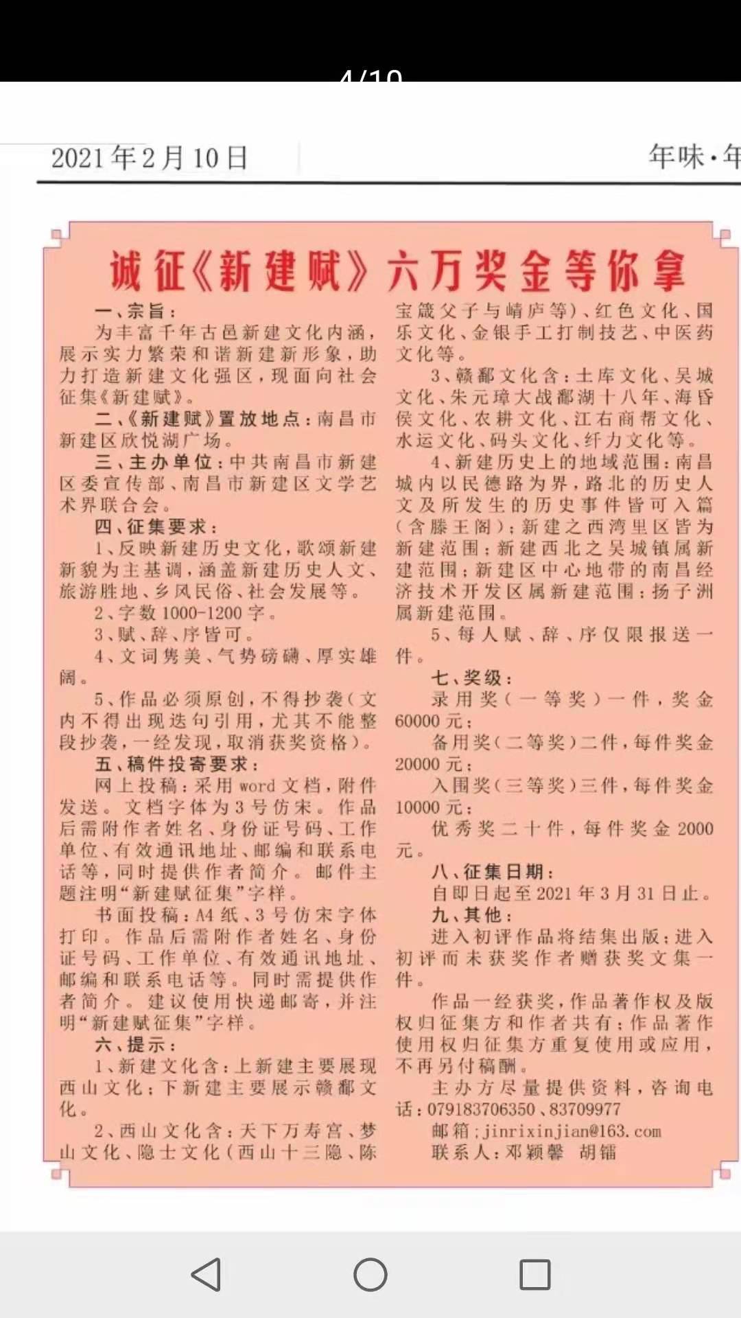 诚征《新建赋》 六万奖金等你拿 一、宗旨: 为丰富千年古邑新建文化内涵,展示实力繁荣和谐新建新形象,助力打造新建文化强区,现面向社会征集《新建赋》。 二、《新建赋》置放地点:南昌市新建区欣悦湖广场。 三、主办单位:中共南昌市新建区委宣传部、南昌市新建区文学艺术界联合会。 四、征集要求: 1、反映新建历史文化,歌颂新建新貌为主基调,涵盖新建历史人文、旅游胜地、乡风民俗、社会发展等。 2、字数1000-1200字。 3、赋、辞、序皆可。 4、文词隽美、气势磅礴、厚实雄阔。 5、作品必须原创,不得抄袭(文内不得出现迭句引用,尤其不能整段抄袭,一经发现,取消获奖资格)。 五、稿件投寄要求: 网上投稿:采用word文档,附件发送。文档字体为3号仿宋。作品后需附作者姓名、身份证号码、工作单位、有效通讯地址、邮编和联系电话等,同时提供作者简介。邮件主题注明“新建赋征集”字样。 书面投稿:A4纸、3号仿宋字体打印。作品后需附作者姓名、身份证号码、工作单位、有效通讯地址、邮编和联系电话等。同时需提供作者简介。建议使用快递邮寄,并注明“新建赋征集”字样。 六、提示: 1、新建文化含:上新建主要展现西山文化;下新建主要展示赣鄱文化。 2、西山文化含:天下万寿宫、梦山文化、隐士文化(西山十三隐、陈宝箴父子与崝庐等)、红色文化、国乐文化、金银手工打制技艺、中医药文化等。 3、赣鄱文化含:土库文化、吴城文化、朱元璋大战鄱湖十八年、海昏侯文化、农耕文化、江右商帮文化、水运文化、码头文化、纤力文化等。 4、新建历史上的地域范围:南昌城内以民德路为界,路北的历史人文及所发生的历史事件皆可入篇(含滕王阁);新建之西湾里区皆为新建范围;新建西北之吴城镇属新建范围;新建区中心地带的南昌经济技术开发区属新建范围;扬子洲属新建范围。 5、每人赋、辞、序仅限报送一件。 七、奖级: 录用奖(一等奖)一件,奖金60000元; 备用奖(二等奖)二件,每件奖金20000元; 入围奖(三等奖)三件,每件奖金10000元; 优秀奖二十件,每件奖金2000元。 八、征集日期: 自即日起至2021年3月31日止。 九、其他: 进入初评作品将结集出版;进入初评而未获奖作者赠获奖文集一件。 作品一经获奖,作品著作权及版权归征集方和作者共有;作品著作使用权归征集方重复使用或应用,不再另付稿酬。 主办方尽量提供资料,咨询电话:079183706350、83709977;陶江 13979153756 邮箱;jinrixinjian@163.com 联系人:邓颖馨 胡镭 |