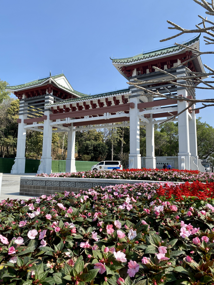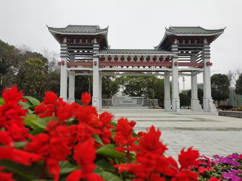 王借岗森林公园二期火山公园入口处新建成的牌楼。/禅城城管供图 四座牌楼有两座已建好,一座位于公园二期火山公园入口处,另一座位于公园二期沙口生态园内。牌楼顶部用上了绿色琉璃瓦、山墙脊瓦,檐角下结构涂成暗红色,以绿色和红色的配色凸显传统中式色彩氛围。门楼造型简洁,色彩淡雅,洋溢浓浓岭南风。另外两个在建的牌楼,一处位于公园三期主入口广场,此牌楼将成为广场地标之一;另一处位于公园东侧入口。