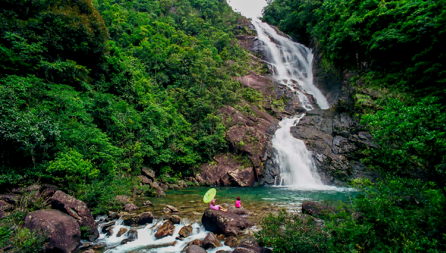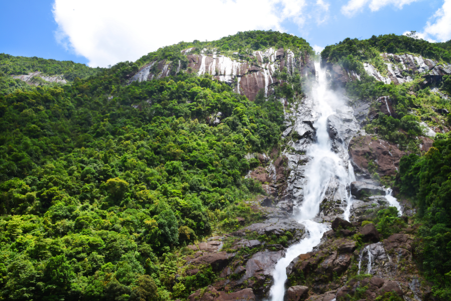 | -- 作者:秋风听雨 -- 发布时间:2022/8/24 2:42:17 -- 五、鹅凰飘瀑 广东鹅凰嶂省级自然保护区位于阳春市西南部八甲镇,距春城60公里,西接茂名电白,南连阳西,是广东西南部沿海地区面积最大、唯一的一个热带北缘气候类型的保护区,总面积14751公顷。鹅凰嶂自然保护区是森林生态系统类型保护区,主要保护对象是华南地区热带北缘季雨林和山地雨林为主体的森林生态系统。 鹅凰嶂位于八甲大山腹部,地质、气候特点显著,属中山地貌,一般海拔在600—800米,区内最高峰鹅凰嶂海拔1337.6米,是鹅凰嶂自然保护区主峰,也是粤西第二高峰;最低处潭水坳海拔仅30米,高低差异达1307.6米,千米以上山峰有21座。保护区年降雨最高记录5521毫米,具有降水期长,降雨量大的特点。保护区内有植物种类208科、726属、1415种,其中有国家重点保护的珍稀濒危植物猪血木、圆籽荷、虎颜花、大果五加等36种,占广东省珍稀濒危植物的34.95%,是广东省植物种类最丰富的自然保护区,堪称广东物种宝库。 保护区内还有多个自然旅游景点:1.白水瀑布,又称鹅凰飘瀑,位于双顶峰下,距离八甲镇区约5公里,海拔585米,瀑布垂直落差225米,堪称“岭南第一瀑”。2.八甲仙湖,位于八甲大山五指峰下,距离八甲镇区约5公里,于1971年建成水库,用于蓄水发电,又名仙家垌水库。该湖坝顶标高521米,湖面积逾100万平方米,水面宽处1900米,湖水最深入38米,蓄水2230万立方米。仙湖山美、水美、气候美、环境美,著名美术大师关山月曾游此地,盛赞风景优美,题名“仙湖”。3.五福瀑布是白水瀑布的姊妹瀑布,位于仙家垌管理区内,瀑布高150多米,宽50多米,水量充沛,是白水瀑布水量的一倍多。4.阳蓄电站是国家“十三五”水电发展规划中“40万千瓦级超高水头超大容量抽水蓄能机组设计制造自主化”依托项目,总装机容量240万千瓦。该电站有以下特点:800米水头级钢筋混凝土衬砌水道世界第一、单机容量40万千瓦机组全国最大、机组设备全面自主化、工程技术指标和施工难度国内第一。