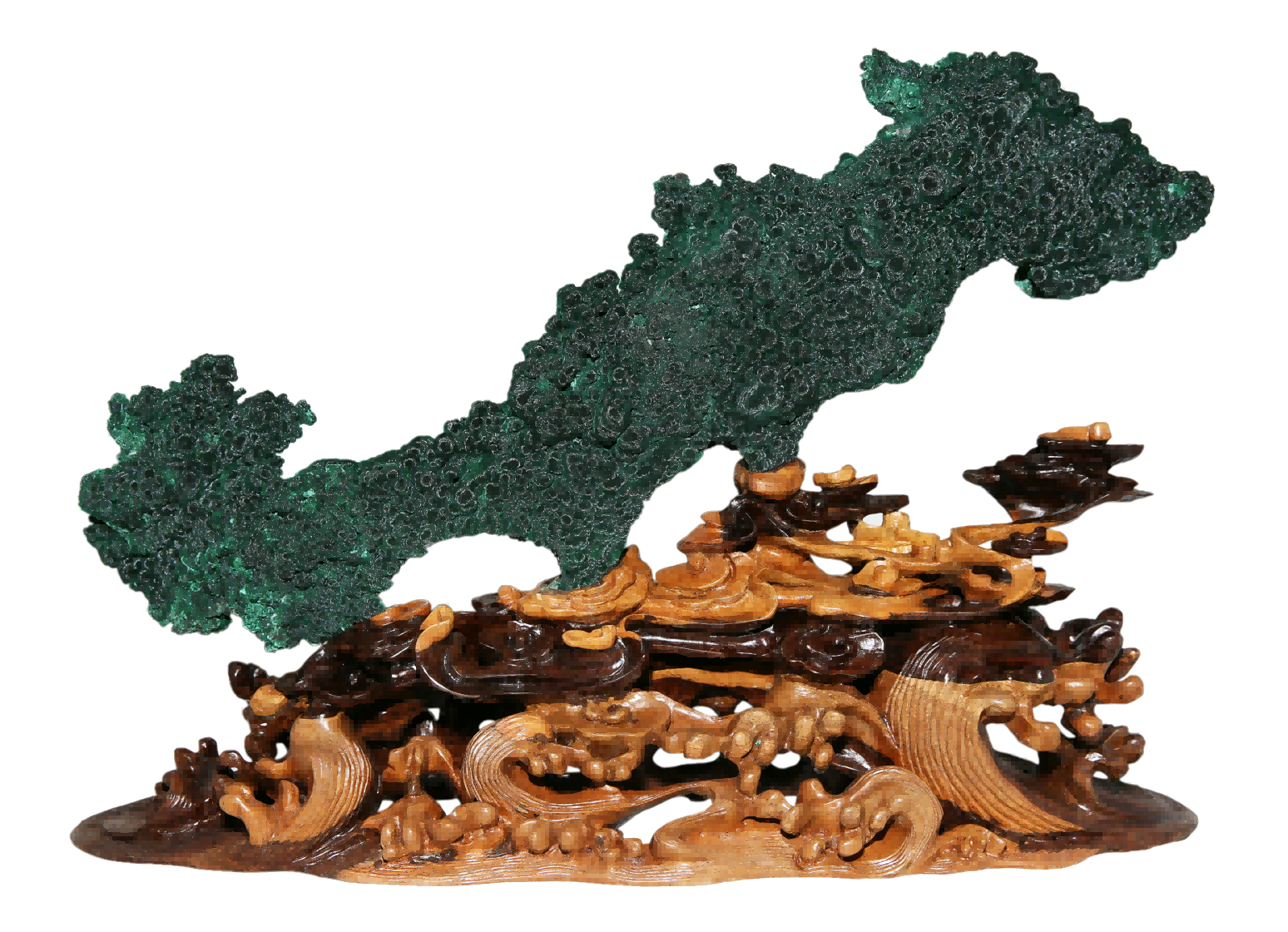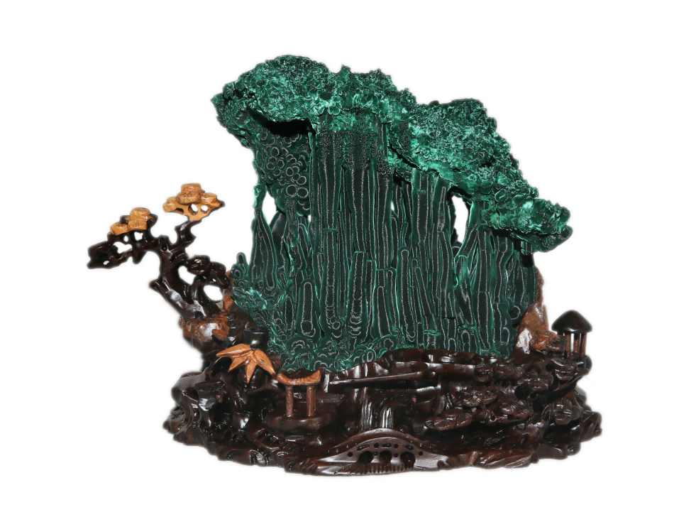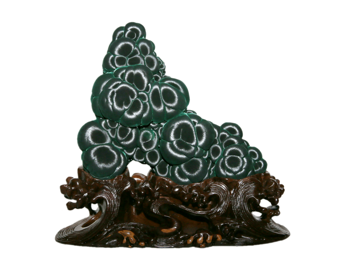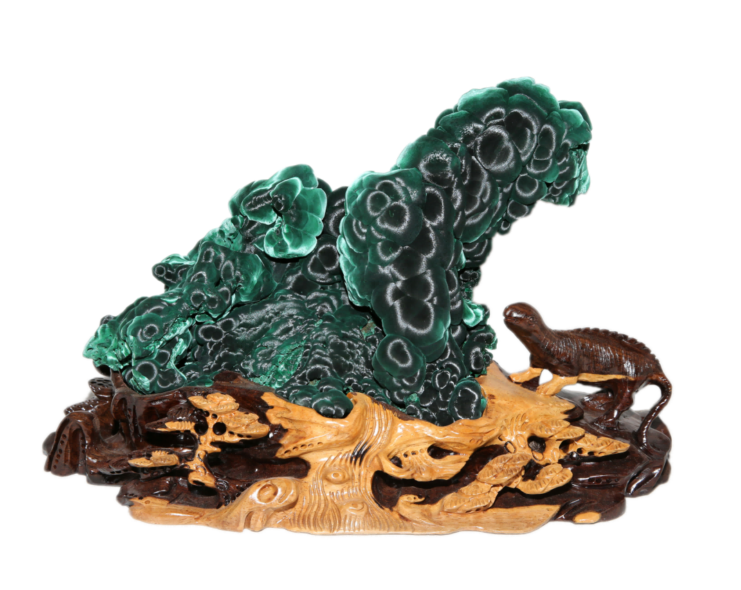 | -- 作者:秋风听雨 -- 发布时间:2022/8/24 2:47:32 -- 十一、阳春孔雀石 阳春孔雀石,产自广东省阳春市石碌铜矿,储量居全国第一,质优色艳,结晶完美。阳春是世界上绚丽多姿孔雀石产地之一,被称为中国孔雀石之乡。 孔雀石以其绿色花纹似绿孔雀羽毛而得名。它是原生含铜矿物氧化后经过内生地质作用形成的次生铜矿物,产于含铜硫化物矿床氧化带中,常与蓝铜矿共生。孔雀石成分为Cu2(CO3)(OH)2,含铜57.5%,呈隐晶质集合体状,不透明,同心层状和纤维放射状结构,玻璃光泽,硬度3.5-4。形态呈葡萄状、钟乳状、块状、针状、绒毛状。色彩丰富,有翠绿、深绿、墨绿、粉绿、粉白、天蓝、还有极罕见的褐红色。因孔雀石同心放射状的特殊肌理结构,致其外表折射神奇的光环,或是锦缎丝光、银绿幻光的变彩现象。 孔雀石是在次生淋滤作用,化学沉淀环境中形成的。石碌铜矿丰富的地下水和独特的岩溶洼地造就了质佳色艳,光彩夺目,千姿百态的孔雀石,在上世纪80年代初就轰动了欧美观赏石界。阳春孔雀石能具形、质、色、纹、光,五美俱全者为绝佳之品,石具五美,意蕴深邃,内涵丰富,价值不菲。 阳春孔雀石既是美丽的矿物晶体,也是珍稀的观赏石,它集灵光宝气于一身,出类拔萃的造型,娇艳诱人的色彩,雍容华贵的体态迷倒了不少赏玩者和收藏者,人们能为获得一、二件阳春孔雀石而感到莫大的庆幸,视它为一种不可或缺的珍贵石种收藏和观赏。