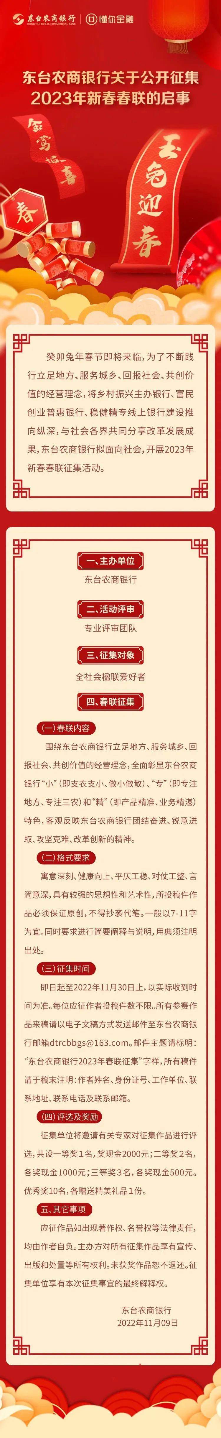 | -- 作者:班首长 -- 发布时间:2022/11/12 23:21:33 -- 22.11.30截止:江苏省盐城市东台市东台农商银行2023年春联征集 [此贴子已经被作者于2022/11/12 23:45:09编辑过] |